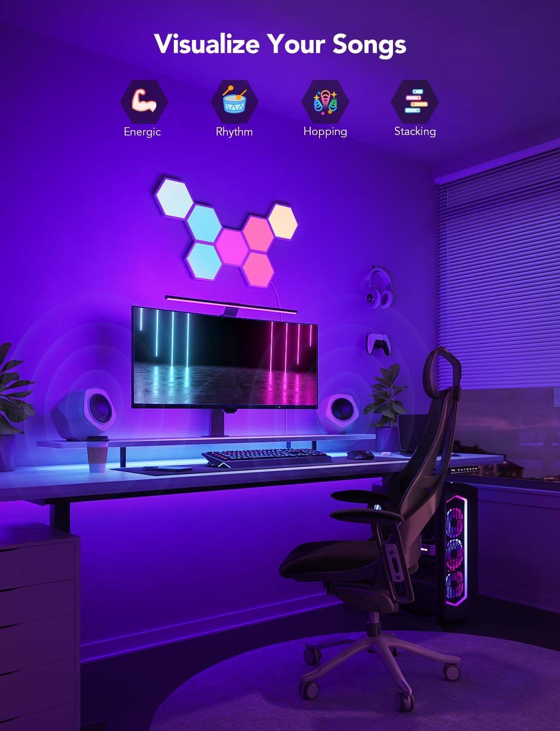 ديكور ألعاب من المستوى التالي: قم بترقية إعداد الألعاب الخاص بك باستخدام Govee Glide Hexa Pro ، الذي يوفر تأثيرات إضاءة ديناميكية ثلاثية الأبعاد تحول مساحتك إلى منطقة ألعاب غامرة.