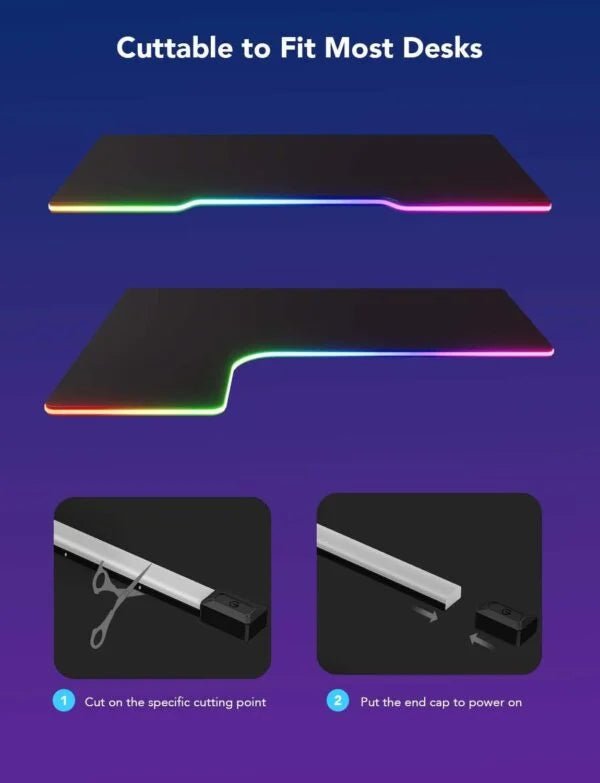- كوتابل: يمكن قطع أضواء شريط الألعاب هذه على 12 نقطة قطع محددة وتغيير حجمها لضمان ملاءمة مثالية لمعظم المكاتب. يتراوح الطول القابل للاستخدام لكل شريط إضاءة بين 214 سم – 300 سم. ملاحظة: لا يمكن تقسيم الضوء.