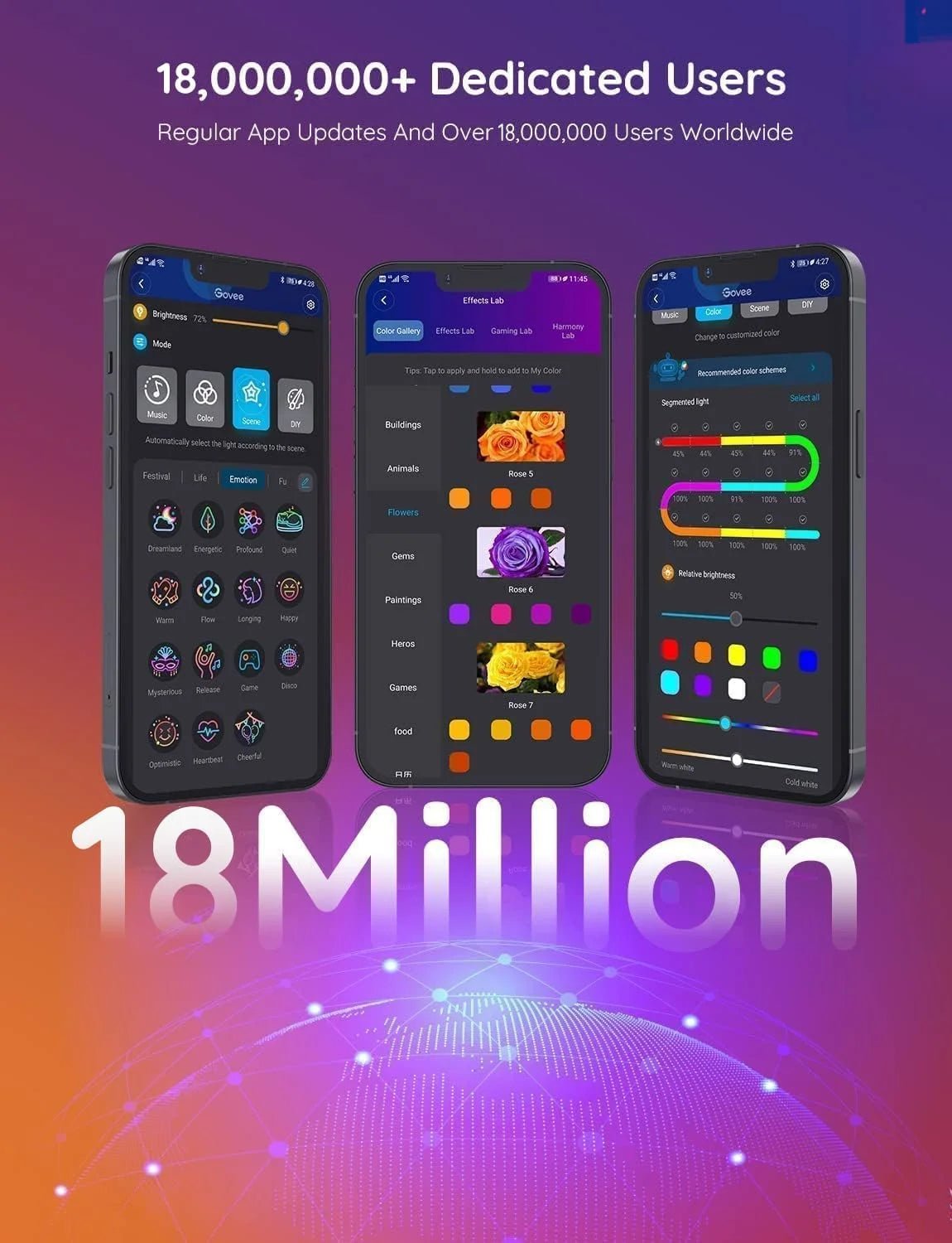 - وظائف التطبيق واسعة النطاق: قم بتوصيل أضواء الشريط LED إلى تطبيق Govee Home لاستكشاف الميزات القوية. اكتشف 16 مليون لون، وأعمال DIY، وأوضاع المشهد المزدحم، والجدولة والتحكم في المجموعة، وميزات المجتمع الرائعة.