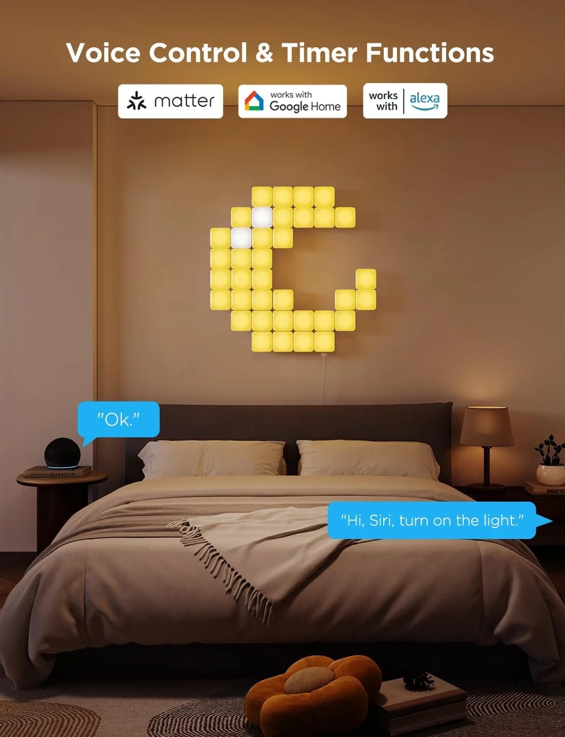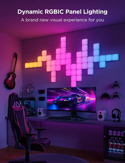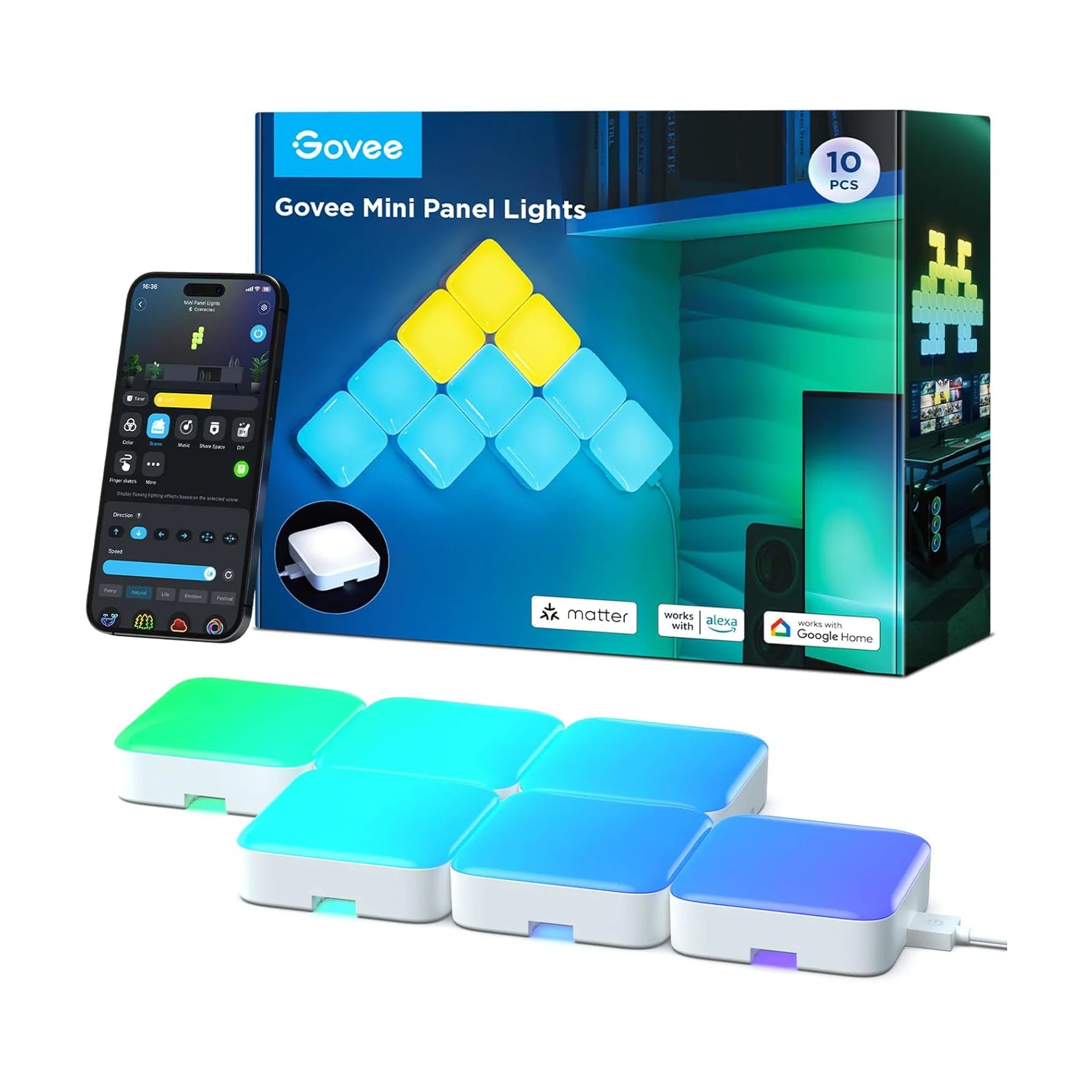 Govee Mini Panel Lights offer vibrant RGBIC colors, smart shape recognition, and endless creative designs with four-side connections. Each set includes 10 panels, and you can control up to 70 panels with one adapter and enjoy voice control with Matter, Google Assistant, and Alexa.