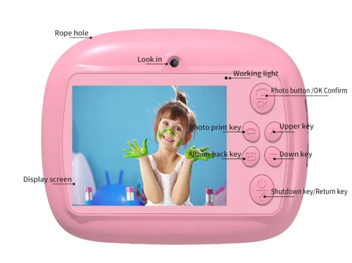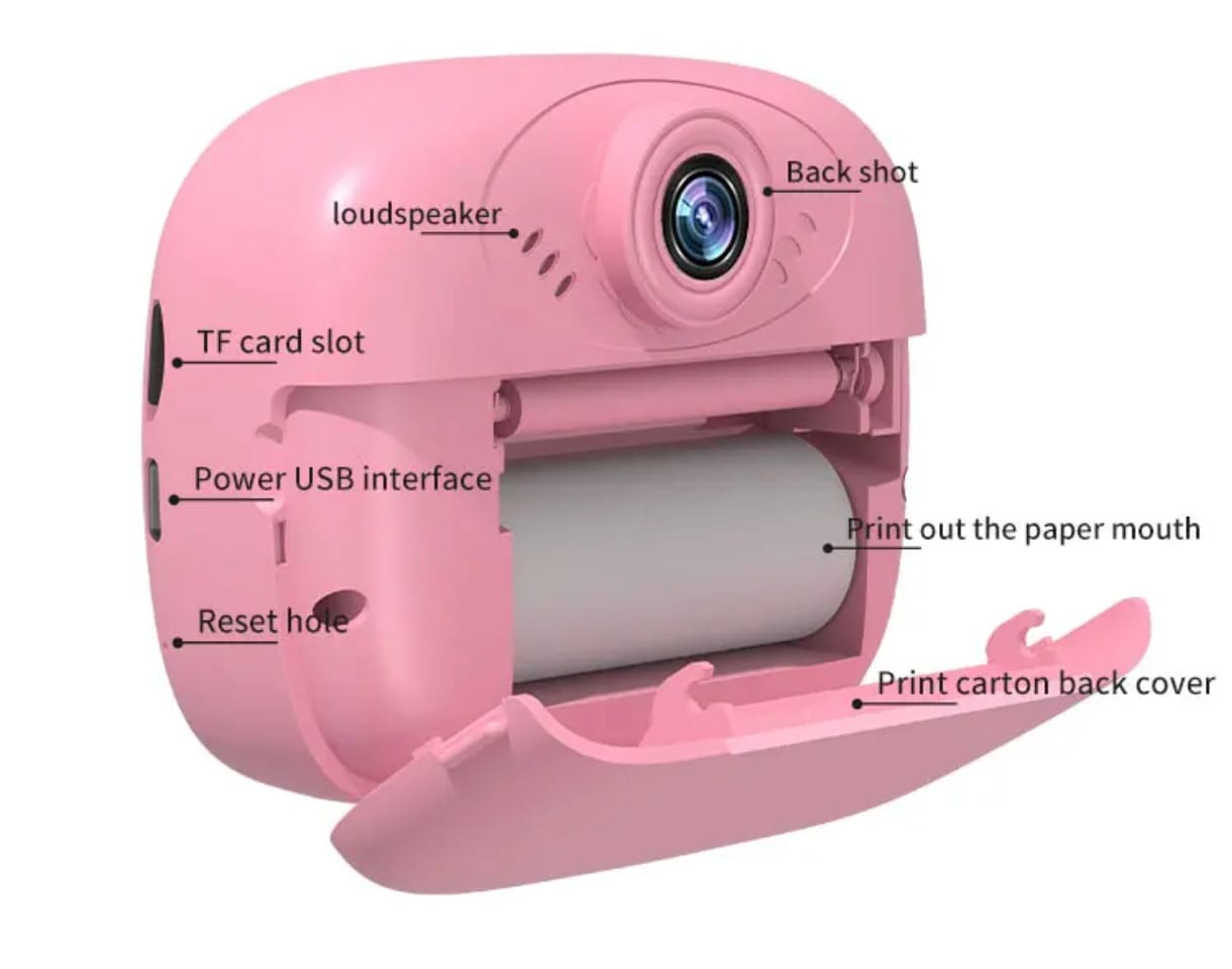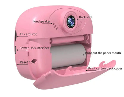 Capture and print memories with the Kids Dino Print Camera. Instantly print black and white photos or use an SD card for colored photos. The 2.4 inch large screen, 1080P video, and 16X digital zoom provide high-quality images. Plus, have fun with games, filters, and frames.