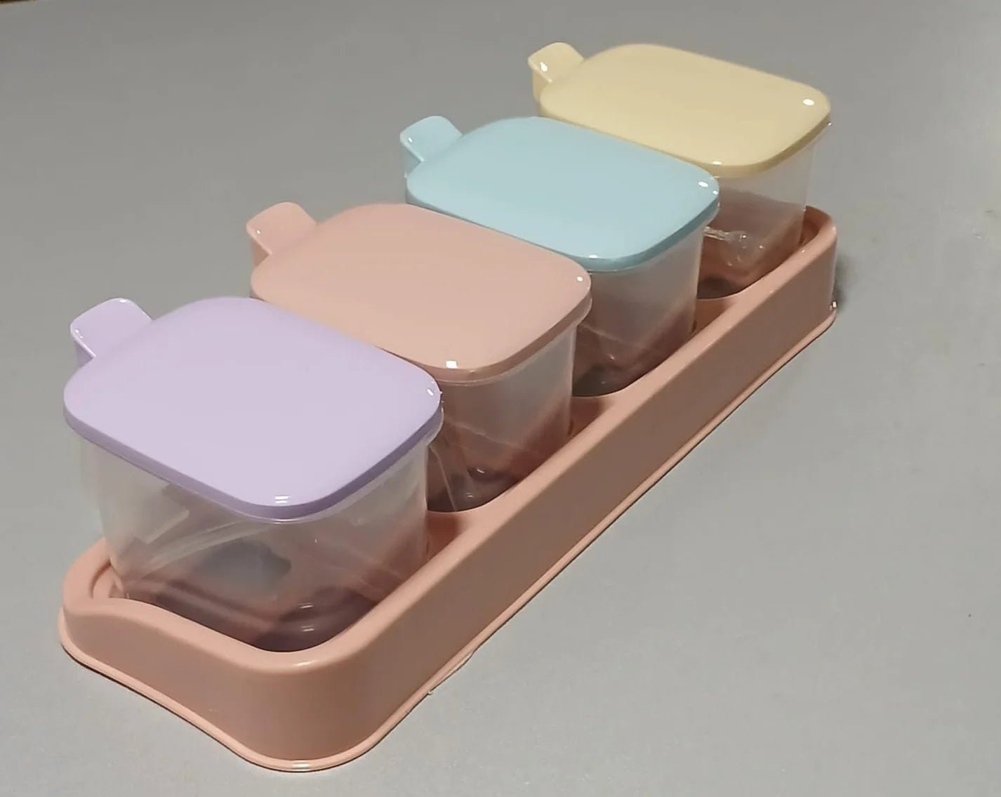 These plastic spice jars with a base come in a set of 4, each with their own plastic spoon for easy measuring. With dimensions of 30 x 11.5 x 8 cm, these jars are the perfect size for storing and accessing your favorite spices. Keep your kitchen organized and your spices fresh with this convenient set.