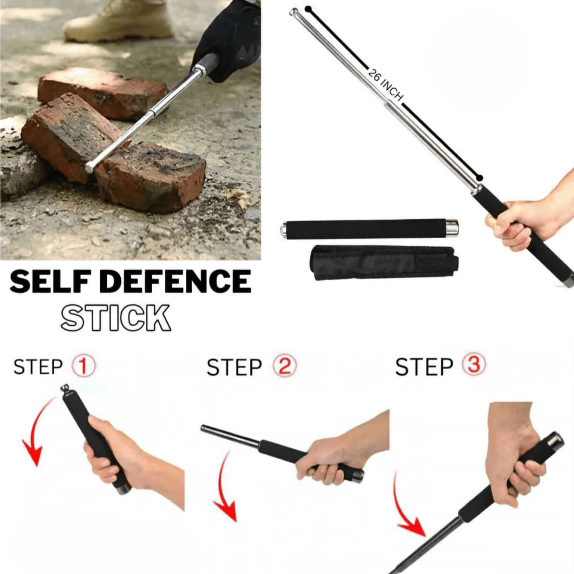 Defend yourself with the compact and portable Self Defense Stick. Easily expandable, it comes with a waist cover for convenient storage. Stay safe and confident knowing you have a must-have personal protection tool.